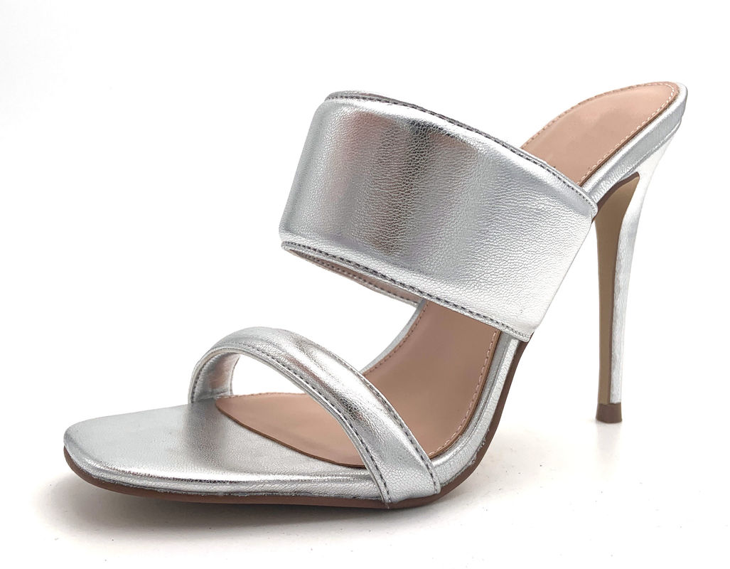 منهج الحد الأدنى مع هذه المزدوجةمغلفة صنادل الحزاممن الجلد المعدني الرقيق ذو اللون الفضينظرة مستوحاة من الظهور القديم، في تناقض مع كعبهم العالي الحاد.